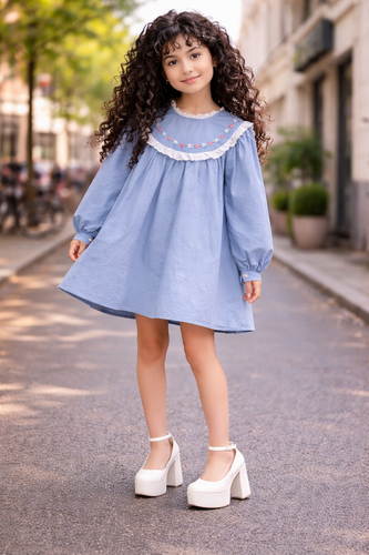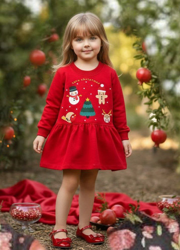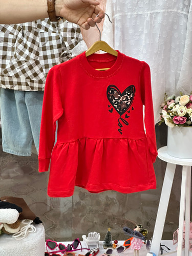 پیراهن دخترانه یقه توری طرح گل قرمز