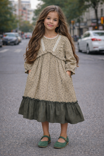 پیراهن چین دار دخترونه طرح گل گلی سبز رنگ