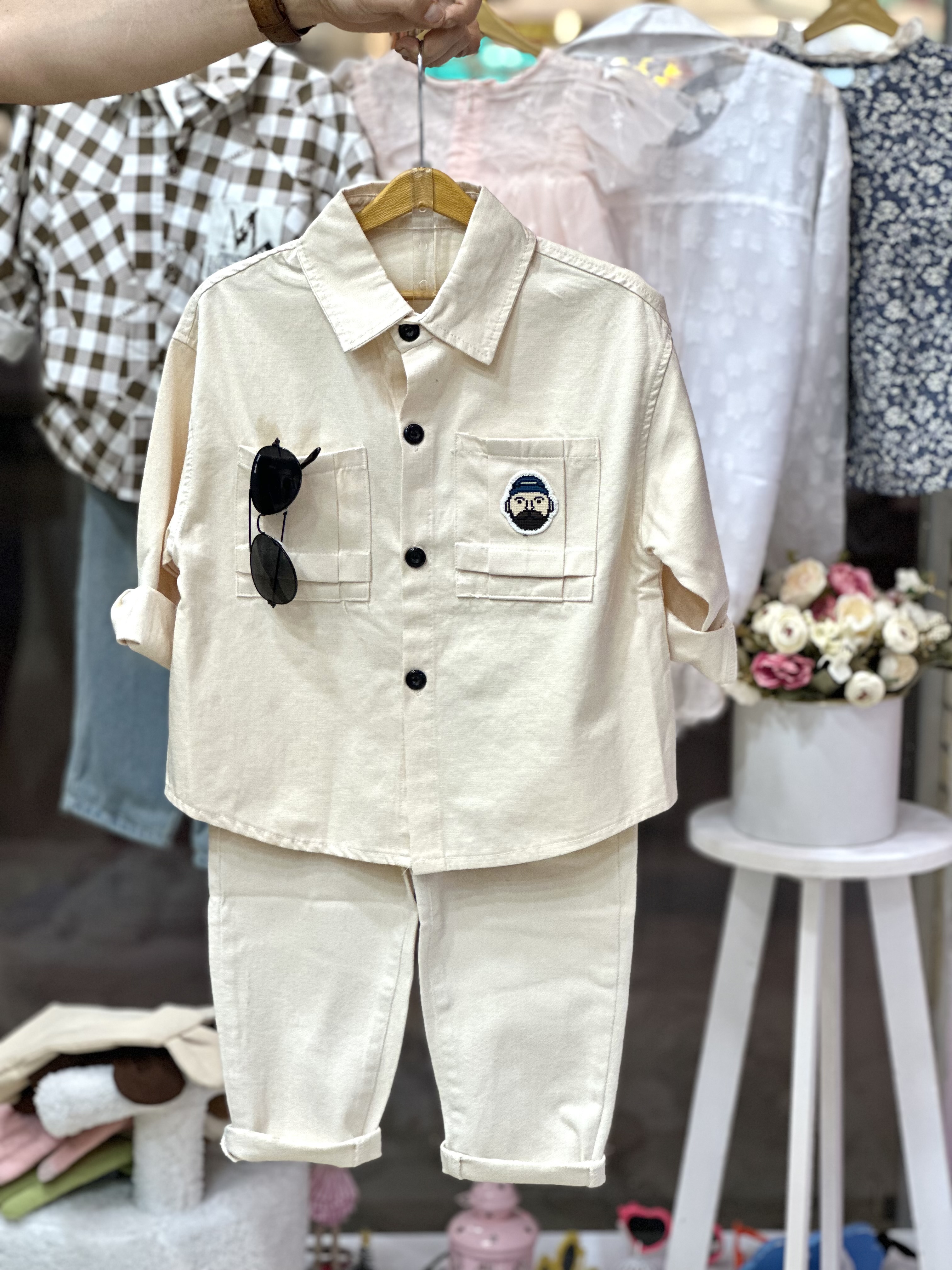 پیراهن پسرونه کتان دوجیب طرح ادمک رنگ کرم